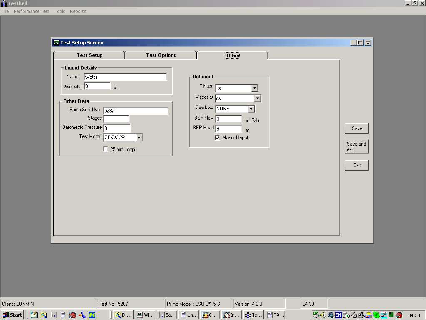 Calculated values such as total dynamic head, pump efficiency, specific energy, Qbep etc are displayed live on the screen.